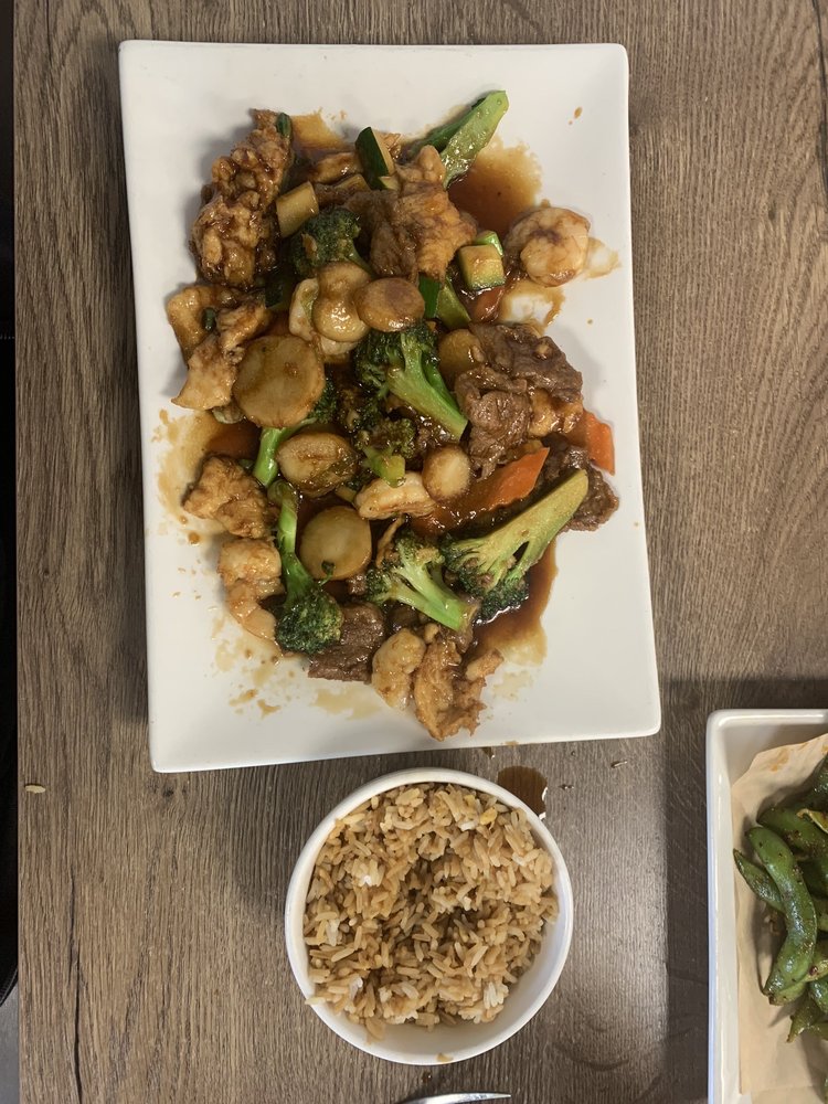Chicken, Beef, Shrimp, Broccoli, Zucchini, Water Chestnuts, Carrots in savory brown sauce